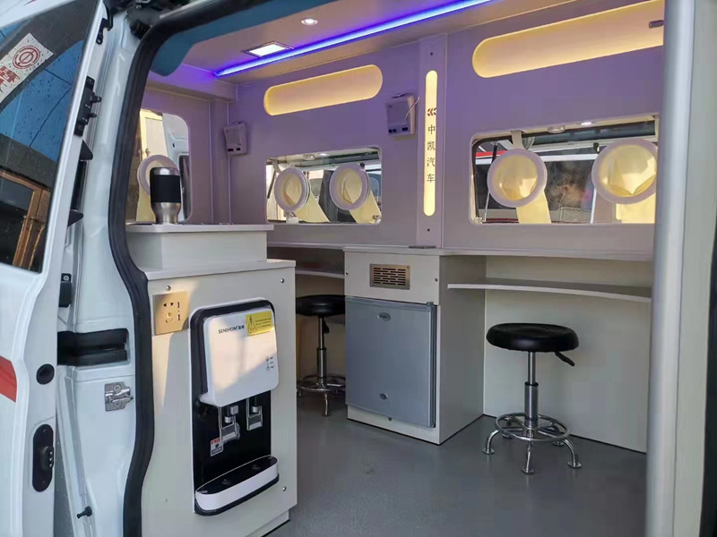 核酸檢測采樣車,采用江鈴福特推出的福特新世代全順底盤改裝。整車參考 相關(guān)行業(yè)標(biāo)準(zhǔn),集成正壓防護(hù)、溫度調(diào)節(jié)、對講、樣品傳遞、車內(nèi)消毒等功能,可迅速部署于戶外,為群體核酸咽拭子采樣、樣品登記及樣品整理提供有力支撐;在整個作業(yè)過程中確保醫(yī)務(wù)工作人員與受檢人員無直接接觸,最大限度的保障了一線醫(yī)務(wù)工作人員的作業(yè)安全,為新型冠狀病毒核酸樣本采集及樣品整理提供了防護(hù)屏障及舒適的工作環(huán)境。