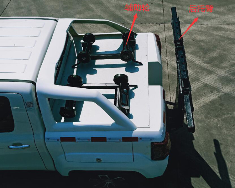 按下托臂降按鈕,將托臂與被拖車輛輪胎接觸,按下托胎收按鈕抱緊輪胎。原車配載輪胎按法規(guī)要求僅允許托舉1噸的車輛,請謹(jǐn)慎作業(yè)。